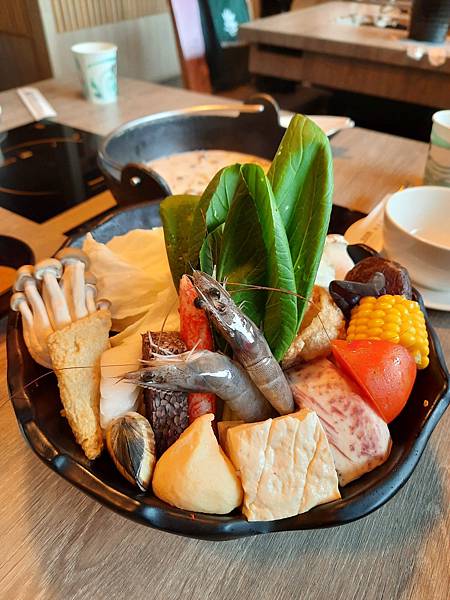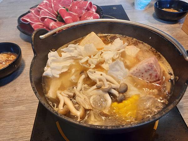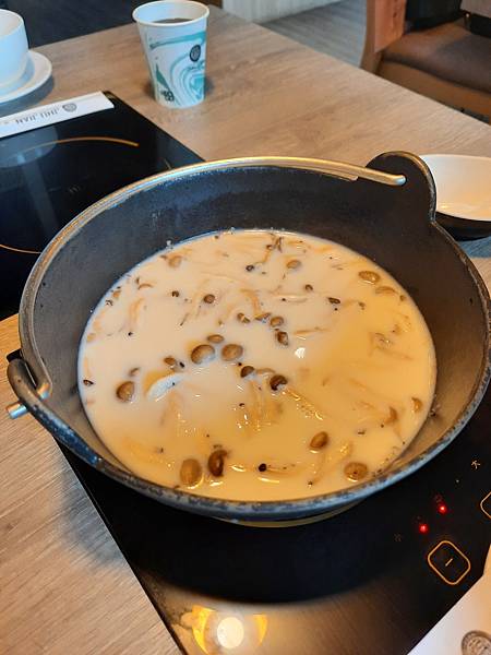濃郁的奶香湯底加上鴻喜菇,適合搭配豬肉主餐。 所以這一定是搭配梅花豬啦~~