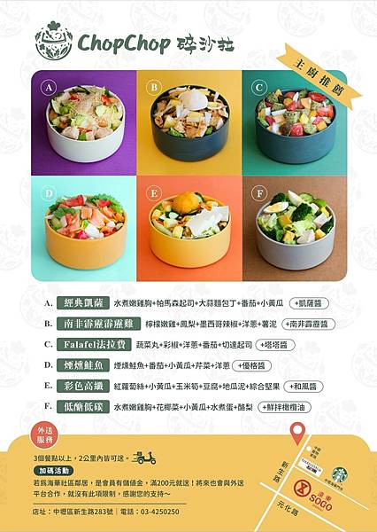 主要是販售沙拉輕食 ,帶入歐美最新切碎型態的沙拉,每一口配料均勻,也為忙碌的現代人帶來更均衡的營養。