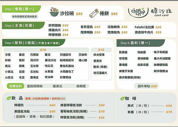 主要就是Step 1 先選你要 沙拉 or 捲餅 85元往上加 ~