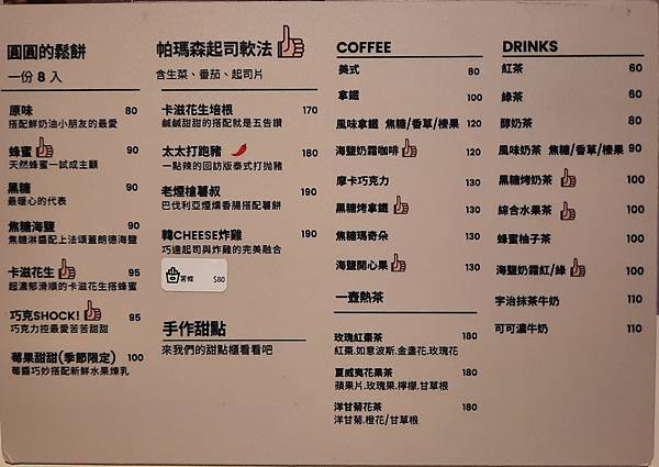 菜單有圓圓鬆餅、軟法、咖啡、飲品、手工甜點等,手工甜點以每日提供為主