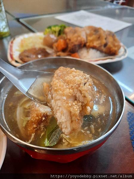 外皮炸的酥脆、口感紮實、肉質鮮甜的香酥土魠魚,加上有高麗菜及筍絲的勾芡湯頭,湯頭上桌前已加入烏醋調味。