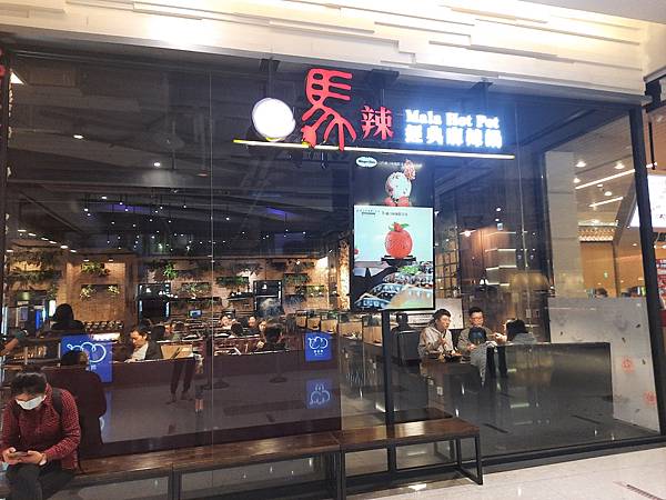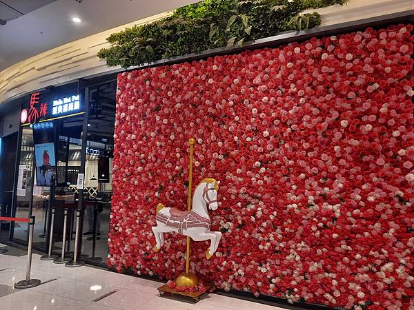 新馬辣位在大江購物中心的B1層,一大片玻璃櫥窗明亮簡潔,旁邊還設計了一個紅色玫瑰花牆。