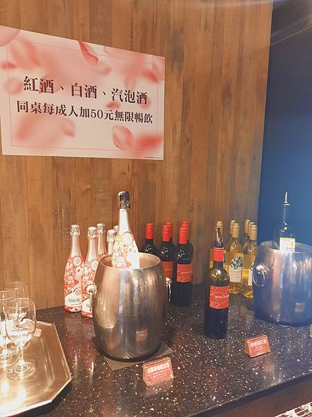 更狂的來了,竟然還有紅白酒和氣泡酒無陽暢飲!只要同桌每成人加50元就能讓你隨便喝。