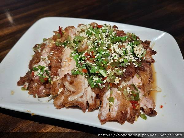 肉質鮮嫩 外皮酥脆 淋上微辣酸的醬料 很下飯阿~~