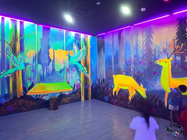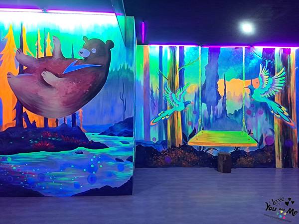 第三站 想像力製造區旁邊的夜光隧道,走進隧道內,整面牆的大幅螢光畫作讓人來到了夜光世界,利用夜光筆的特性,配合燈光,打造了這區夜光動物世界