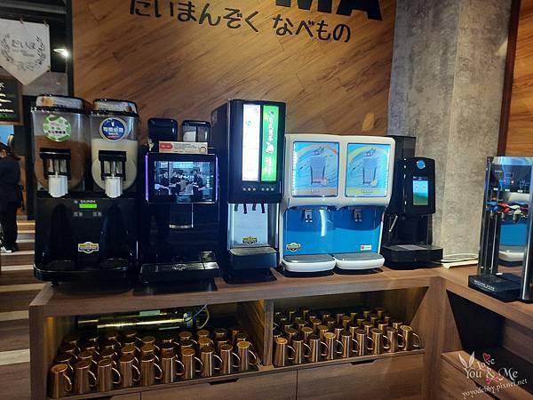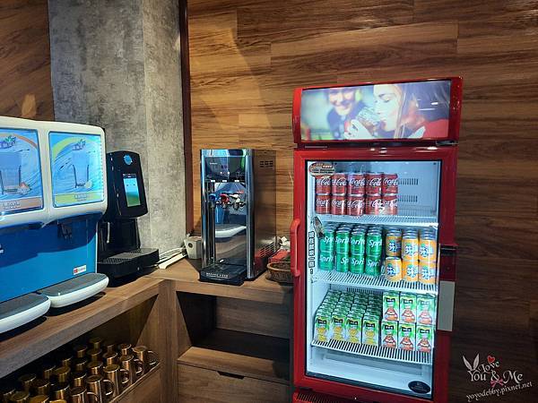 冰箱裡有瓶裝果汁飲料跟罐裝汽水等,全部都是無限量暢飲,更特別的是咖啡豆還是用星巴克的!!