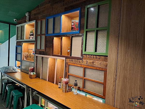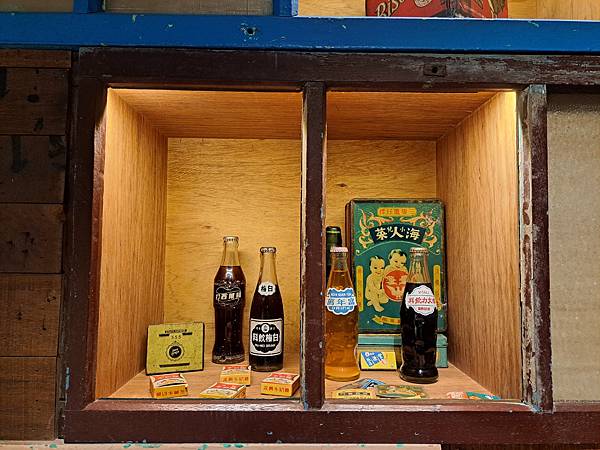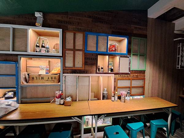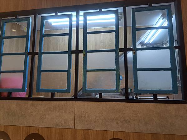 裡面的牆面還有擺放一些復古品牌裝飾,看看這個有年代感的窗戶,把它拿來做成廚房的隔間!