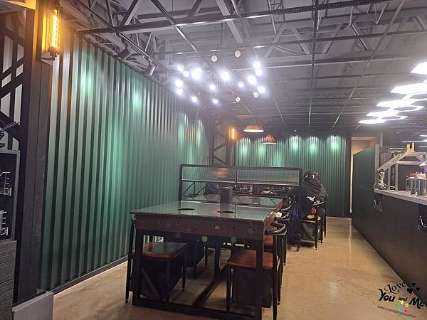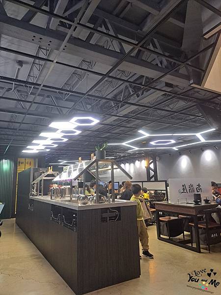 天花板用燈光營造科技未來感,好酷喔!! 裡面的牆面也有一半的鼎字,2旁的牆面也用鋼板做牆面裝潢及造型,整個就像科技感火鍋店。
