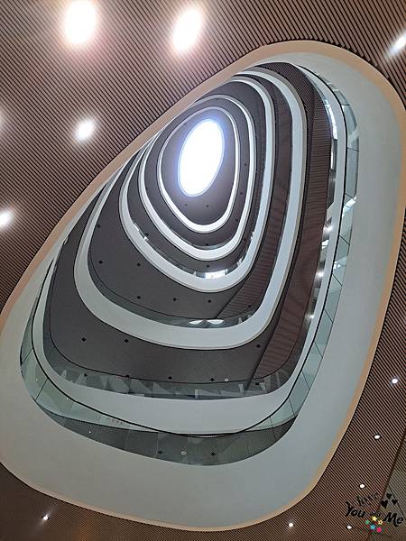 突然抬頭仰望大廳,不規則圓形迴旋式的造型超特別,整棟建築設計真的很時尚又吸睛。