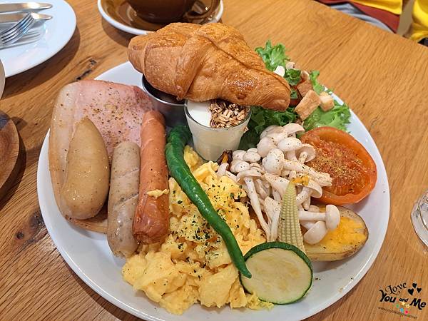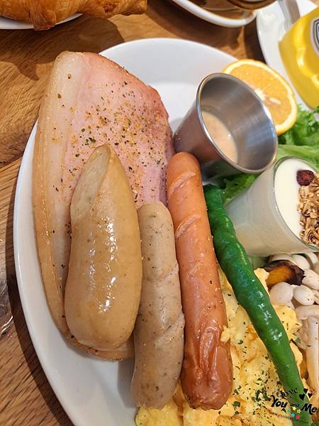 經典總匯,裡頭有法國大可頌、後切火腿、百里香早餐腸、切達起司香腸、法蘭克福腸、奶油炒蛋、爐烤南瓜、季節時蔬、迷你燕麥優格杯…等,店家很貼心,若不吃生菜沙拉的,可以換成大杯燕麥優格杯。