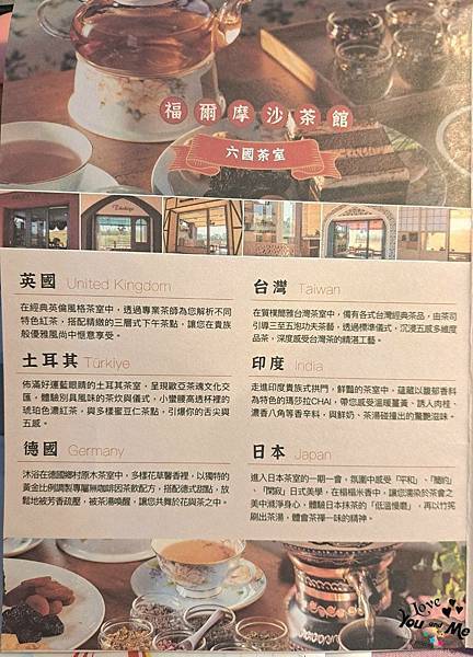 六國茶室有英國/台灣/土耳其/印度/德國/日本 。頂級VIP包廂饗宴,每人極致尊榮超值價$1000元,預訂人數最少四人,最多六人體驗限時90分鐘。活動皆有專業調茶司服務,講解各國茶的文化與歷史,全室使用經典主題茶具,並由調茶師導教學茶席布置。包含各國茶點及茶飲喔~~