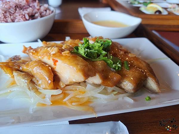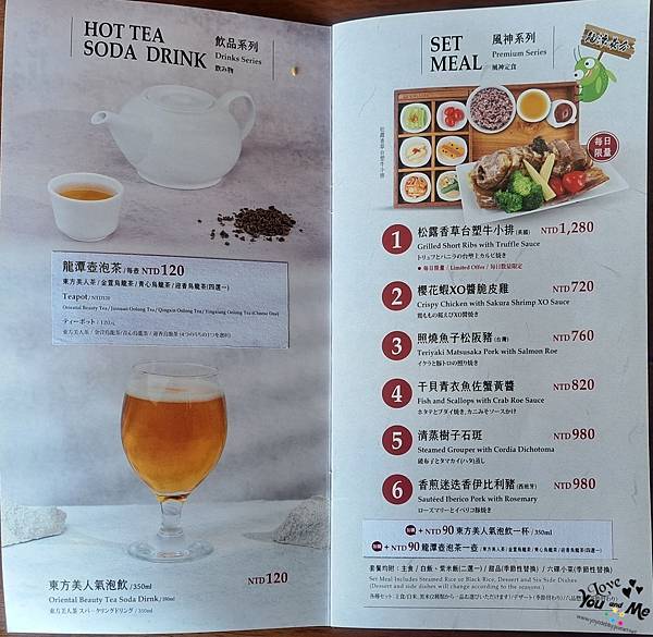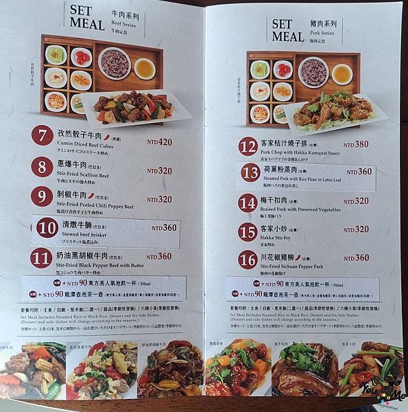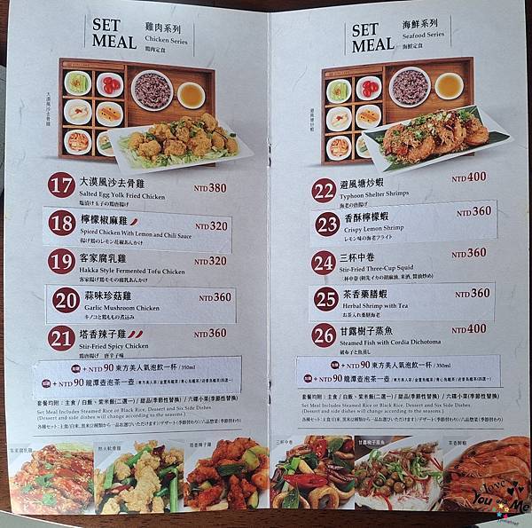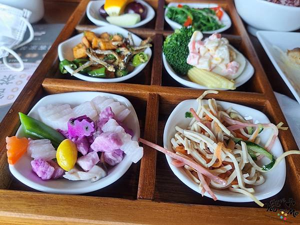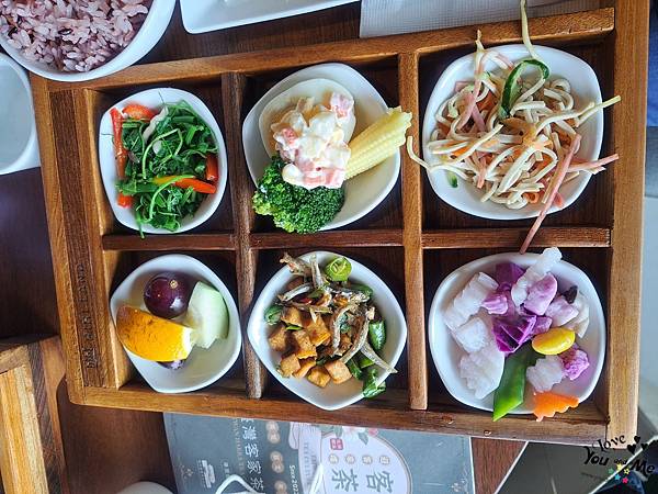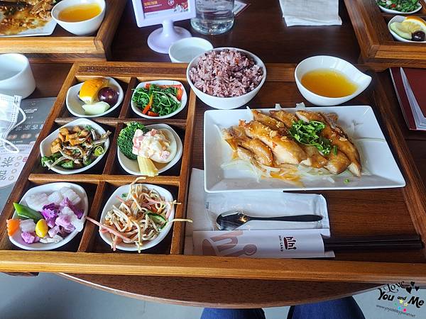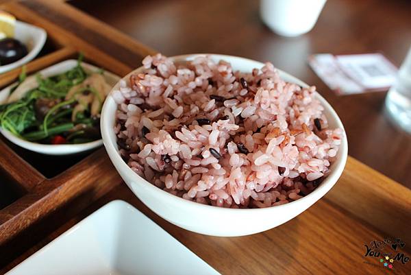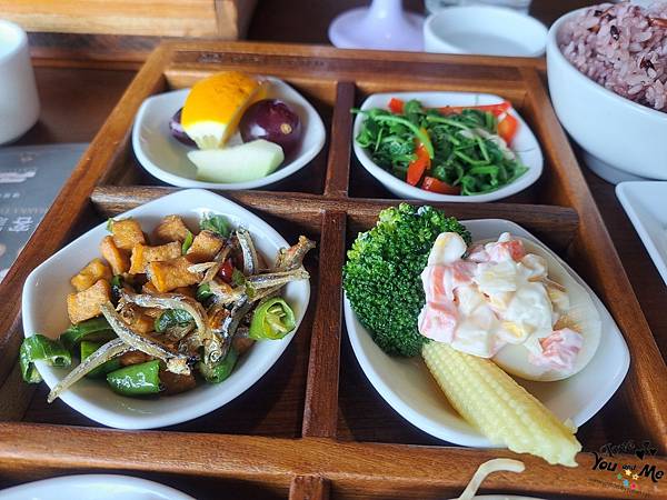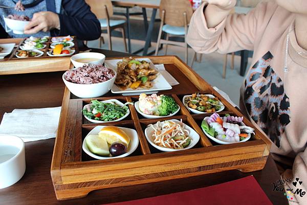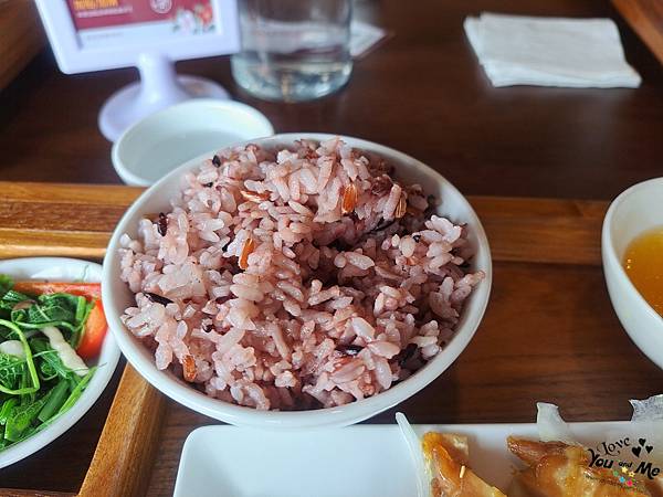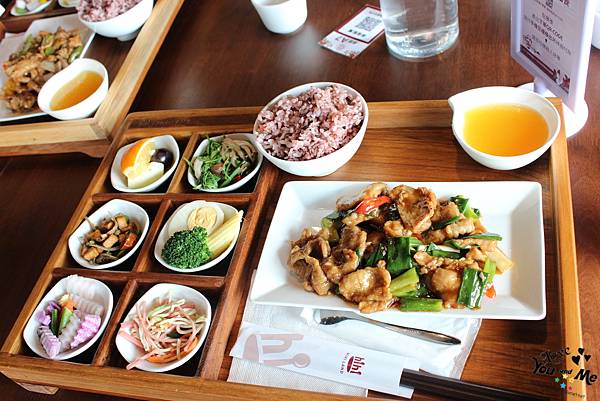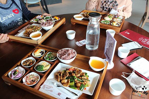 這邊都是套餐形式,一個套餐會有六個不一樣的小菜,先選主菜,在選擇紫米飯/白飯/不要飯。另外也可加價90元有茶品。因為我們剛才從樓下喝完茶上來所以就沒有另加購茶飲囉~ 不過不用擔心,這邊也有提供白開水,自取~~