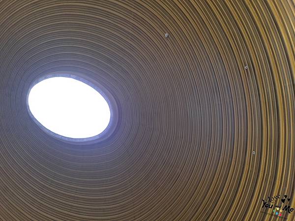 進入眼簾的是天光大廳,金黃色的中空圓頂大廳,意涵了當地的銅鑼圈(客家茶業文化館位於當地的銅鑼圈內),這邊的回音效果很讚喔!據到覽員說是因之前客家採茶時因都各自在山頭,要講話或傳遞訊息很不容易,所以都是用喊的並揮手,吸引注意,打招呼。因為大喊有回音~喊阿喊演變成唱山歌?? 另外導覽員也介紹了一下這裡的地理及當初這棟建築的發想、占地、及花費……等。
