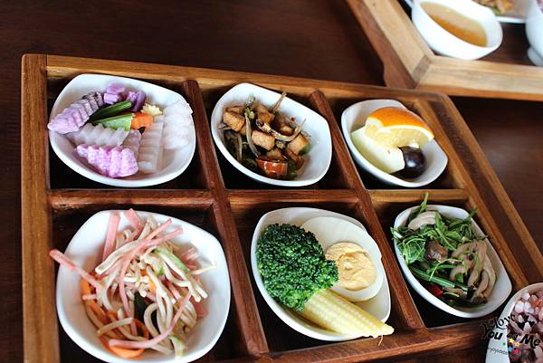 但旁邊還是有一位服務生跟著幫忙端上桌,我想是因為他的餐是放在木製托盤上的,看起來比較有質感,但相對比較重,應該是怕客人拿容易拿不穩吧!!!