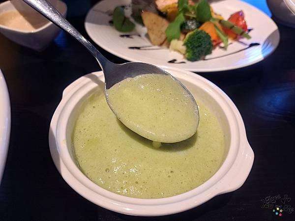 每日濃湯 : 羽衣甘藍濃湯 今天剛好提供的是羽衣甘藍濃湯,營養價值極高的羽衣甘藍,沒想到做成濃湯也好喝喔~~ 應該是純蔬菜汁加上奶油烹調而成的。