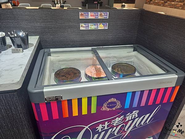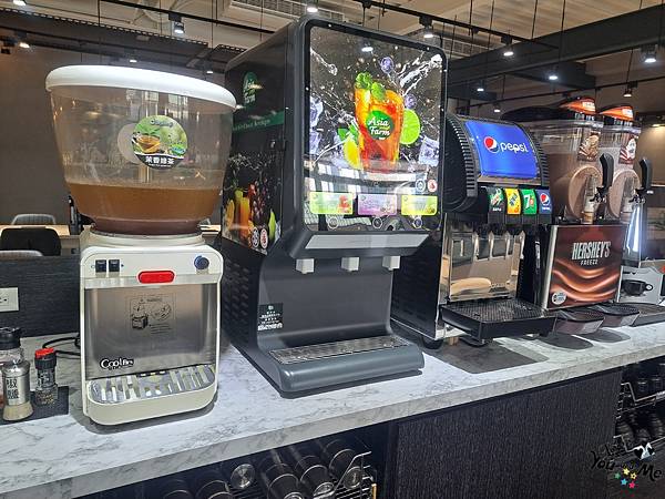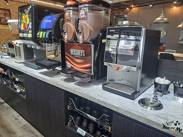 中間是飲料自助吧及餐具自取區。餐具全部都要自取喔!桌面上沒有放!桌上只有先放置碗。飲料吧有汽水機、咖啡機、冰沙機、還有果汁機。果汁機還有提供100%果汁!?還蠻好喝的!另外還有杜老爺冰淇淋。