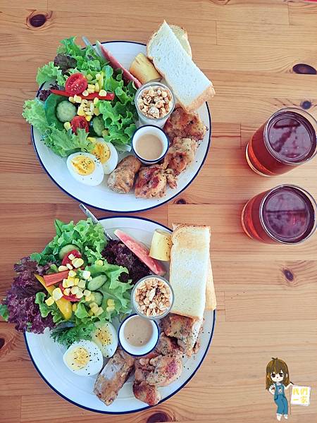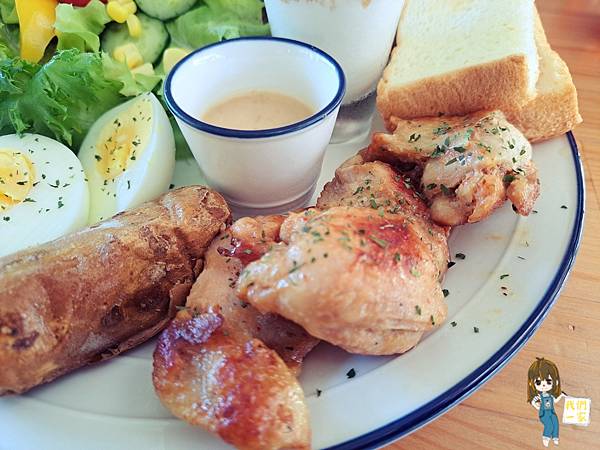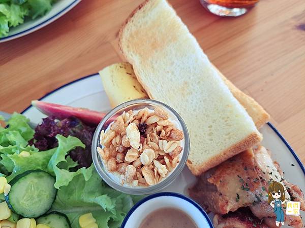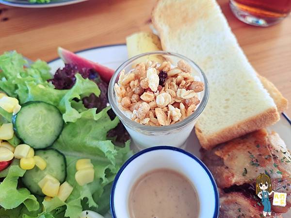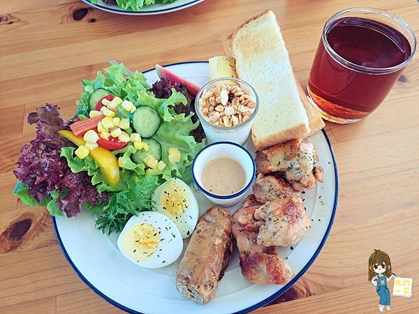 嫩滑多汁的雞腿排,外皮煎至金黃酥脆,充滿誘人的焦香味。搭配上層次豐富的香料和調味,使得每一口都充滿著濃郁的風味。新鮮的水耕生菜沙拉、加上一顆水煮蛋、一片麵包、紅心芭樂、更特別的它是搭配冰心地瓜,中間還有一杯堅果優格,整盤顏色豐富又營養。