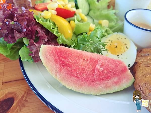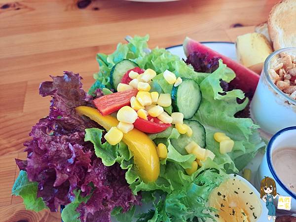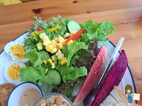 [水耕生菜、水煮蛋、麵包、水果、冰心地瓜、自製小點】