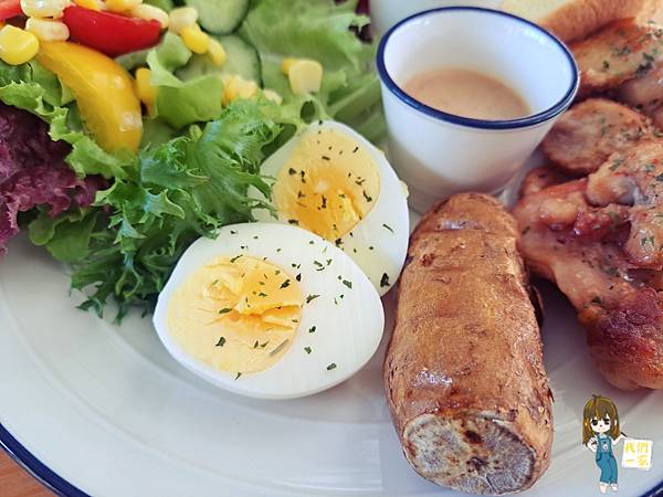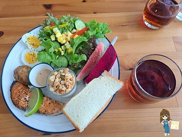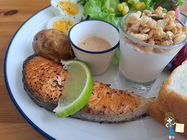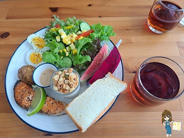 檸香煎鮭魚早午餐 $310 水耕生菜、水煮蛋、水果、麵包、冰心地瓜、自製小點
