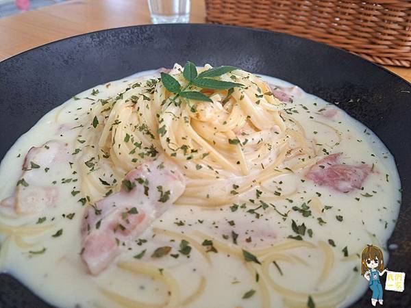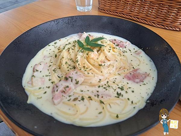 煮的帶有點彈牙口感的義大利麵條,能感受到麵條的嚼勁,與濃郁的奶香白醬以及香脆的培根形成完美的搭配。