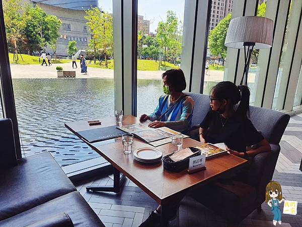 店內空間挑高,採光良好,讓人感到寬敞明亮。更幸運的是今天我們被安排到落地窗區, 不但光線充足,還可欣賞到戶外的造景水池。微風吹拂著水池,波光粼粼的景色令人感到格外放鬆。媽媽看著水面的波紋,甚至還感覺她好像會隨著水波搖晃呢~~ 哈哈哈!!