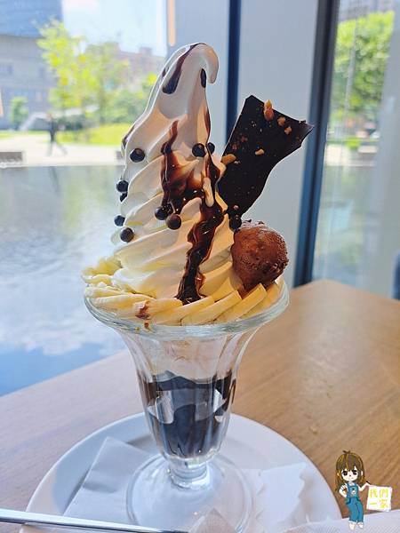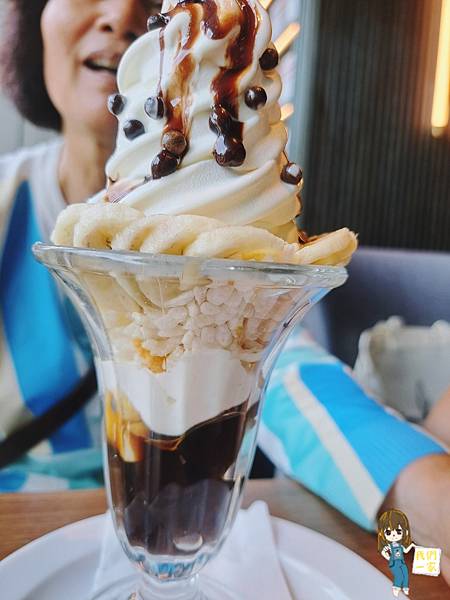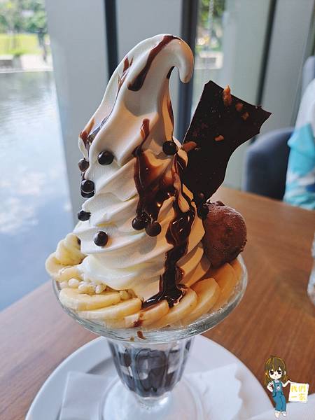法式巧克力香蕉聖代以咖啡凍為基底,融合多重風味和口感,是一道充滿驚喜與歡樂的甜點。晶瑩剔透的咖啡凍帶來濃郁的咖啡香氣,往上有豐富的鮮奶油搭配著略帶苦味的咖啡凍。中間竟然還有古早味米香,切片的香蕉鋪在米香上,鮮黃色的香蕉片在擠上日本北海道霜淇淋,最後再淋上巧克力醬,用巧克力豆加上一片巧克力餅做裝飾,呈現出熱鬧而歡樂的感覺。每一口都能體驗到不同的驚喜與滿足。
