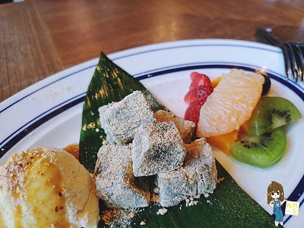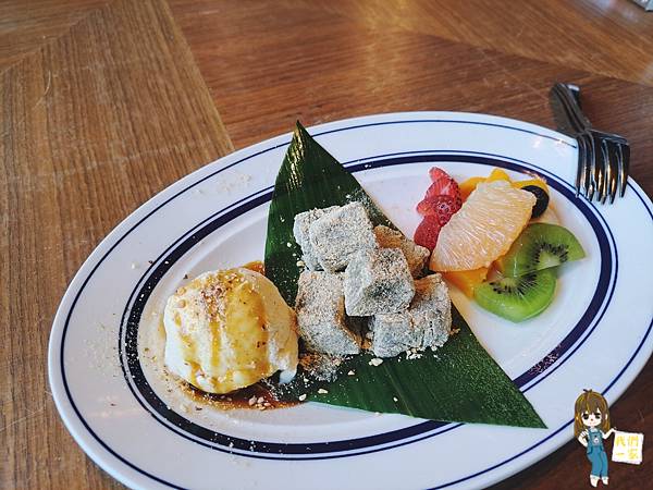 覆蓋著香濃的黃豆粉蕨餅,搭配冰爽的香草冰淇淋,再淋上濃稠的黑糖醬,最後點綴上新鮮水果。這款甜點不僅外觀誘人,還在口感上達到了多重享受,每一口都能體驗到蕨餅的Q彈、黃豆粉的香濃、冰淇淋的冰爽和水果的清新,讓人感受到豐富的味覺層次和無窮的美味驚喜。蕨餅黑糖口味, 甜度剛剛好,QQ的口感