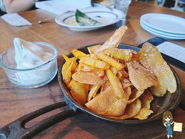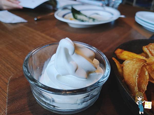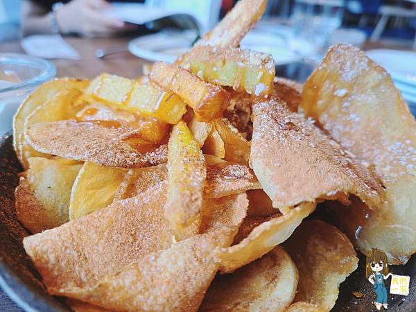 北海道霜淇淋鹽味焦糖洋芋片是一道集視覺與味覺享受於一身的甜點。甜鹹適中的鹽味焦糖淋醬淋在剛炸好的洋芋片+薯條,這種多層次的口感和風味讓人每一口都能體驗到不同的驚喜與滿足。旁邊再搭配柔滑的北海道霜淇淋,可以個別單吃,也可以洋竽片沾點牛奶霜淇淋,味道更是香濃絕倫,是一款甜鹹都有的甜點。