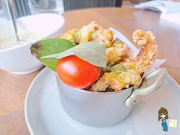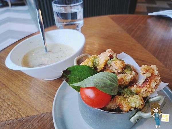外皮裹粉不會太厚,調味不會過重,可以吃到脆脆口感,但也能品嘗到章魚的鮮甜味,搭配著新鮮番茄及九層塔增加風味!! 可惜份量太少了!!