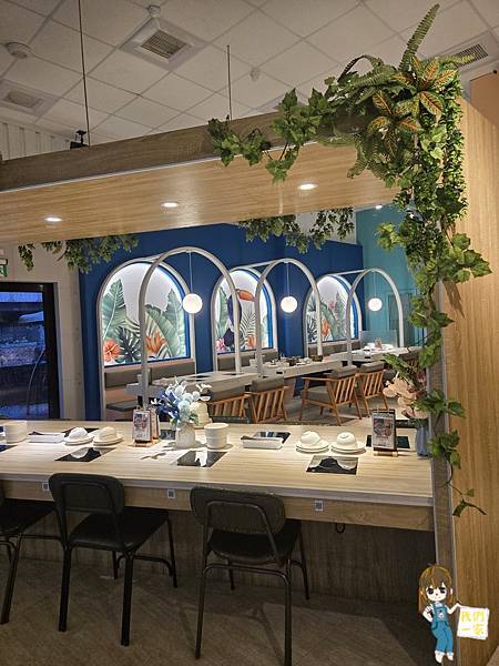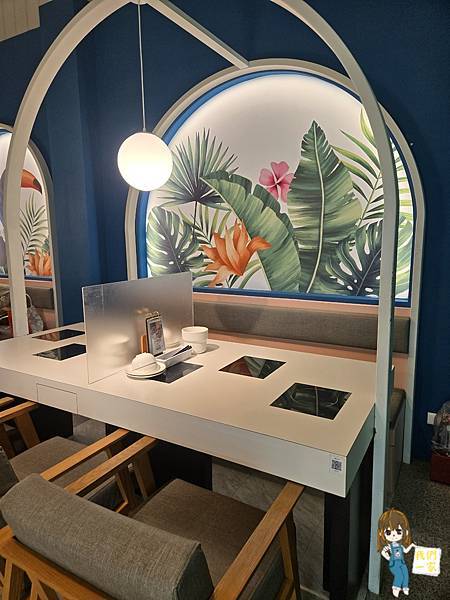 最火紅森林系網美區:牆面以深藍色為主調,搭配大型熱帶植物圖案,營造出一種綠意盎然的感受。特別搭配弧形白框,及圓形燈飾。熱帶植物圖案和鮮艷色彩,營造出一種異國風情,讓用餐體驗更添趣味性。所以這區最熱門~~ 要搶先訂!!