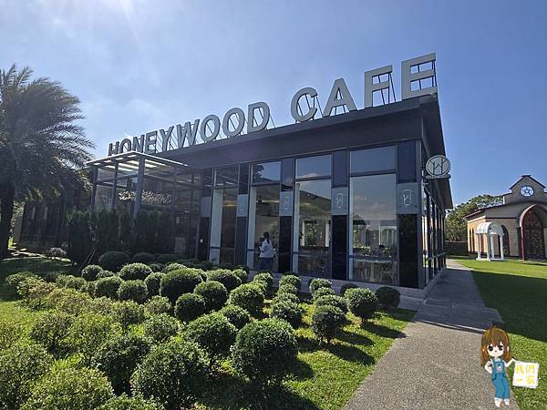 我們今天是預訂了咖啡廳,建築頂端的「HONEYWOOD CAFE」招牌採用簡約現代的字體設計,鮮明且吸引目光,透過陽光印襯在草坪上的字眼也很藝術。外觀以大片玻璃窗為主,通透而明亮,讓自然光線充分灑入室內,與周圍修剪整齊的矮灌木與綠意相互輝映,營造出清新自然的氛圍。