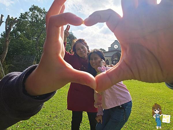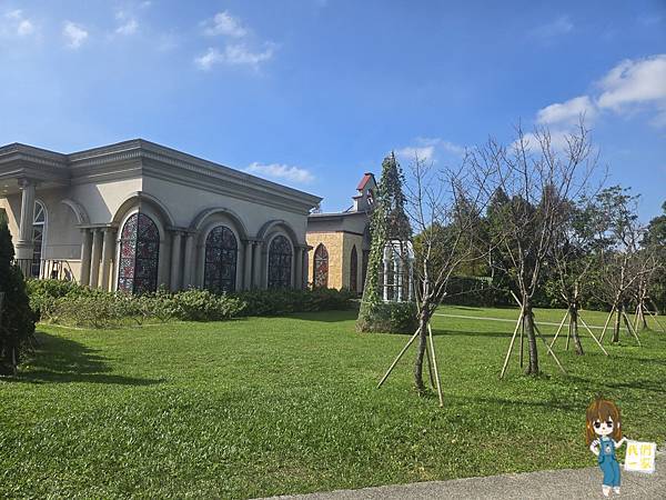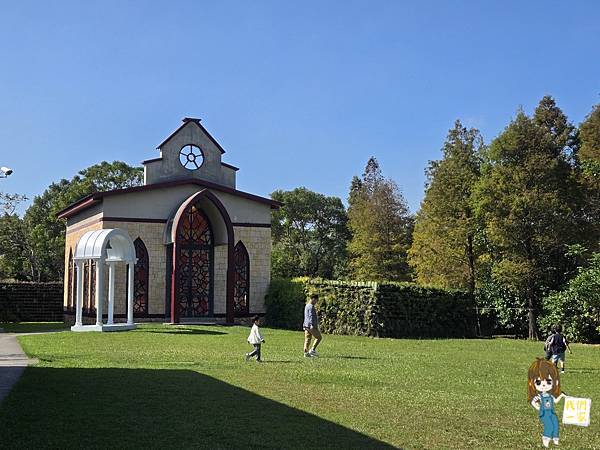 除了大片草地與樹木,園區內的彩色玻璃歐風教堂和其他藝術建築設計為場景增添了多樣化層次,非常適合拍攝浪漫的照片。尤其是午後陽光灑落,景色更顯溫暖動人。
