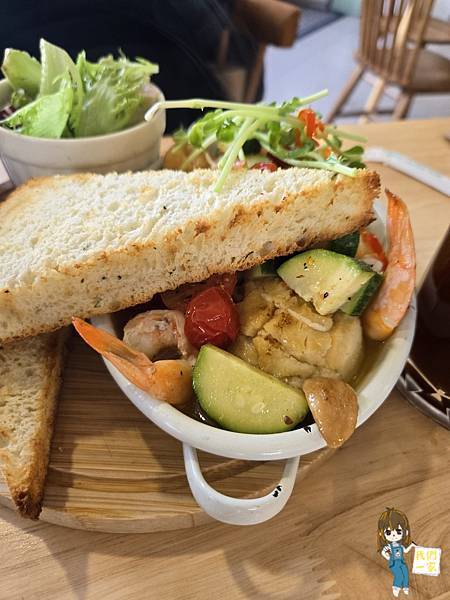 這是一道充滿地中海風味的早午餐選擇,白蝦與魷魚鮮美Q彈,與香茄、櫛瓜和蒜片共同拌炒,散發出誘人的香氣。微辣的辣椒點綴讓味蕾倍感驚喜,而腐嘴豆泥則為整道菜增添了一份濃郁滑順的口感。搭配剛出爐的生佛卡夏麵包,輕輕抹上一點醬料,每一口都令人回味無窮,這份海鮮蒜油蝦的價格為 $390,絕對物超所值。