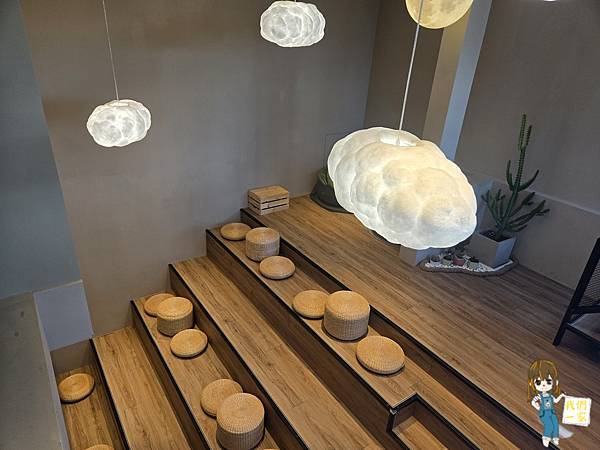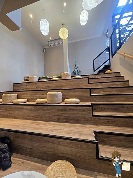 從 一樓到二樓的樓梯間,巧妙設計成一格一格的小平台,搭配草編墊子,為你的聚會增添趣味與輕鬆氛圍。