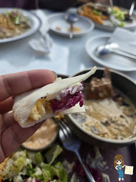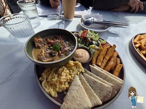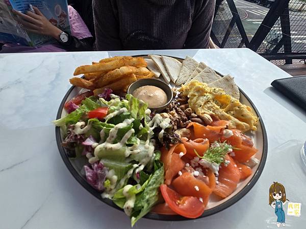 溫熱的 Pita 餅撕開後可以搭配鮭魚與炒蛋,薯條更是金黃酥脆。