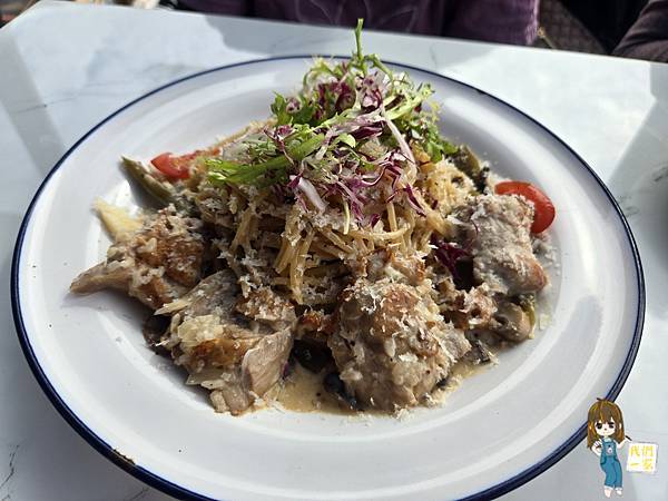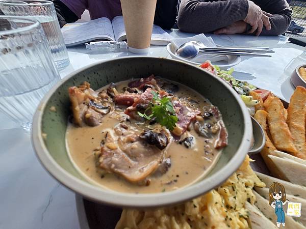 奶油燉雞散發出香濃的奶油氣息,軟嫩的雞肉入口即化,搭配培根片與清脆生菜,讓口感更加豐富。這份早午餐還附上炒蛋與薯條,層次感十足。