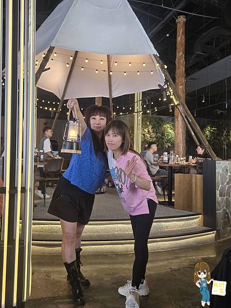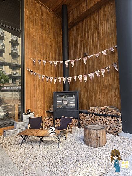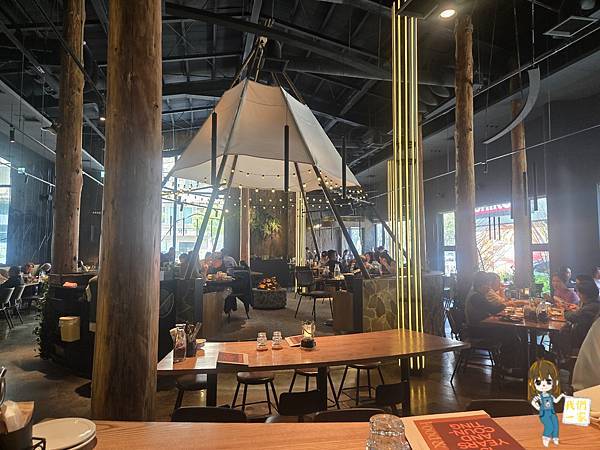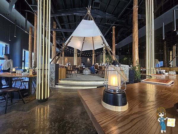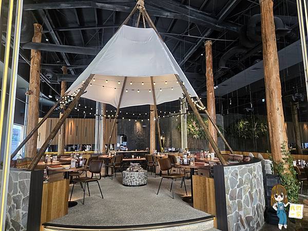 推開大門,一股溫暖放鬆的氛圍撲面而來。餐廳內部以挑高木質屋頂打造開闊視覺,最吸睛的莫過於那座「搬進室內的露營帳篷」!帳篷造景下,木製桌椅錯落擺放,宛如來到森林野餐區,而牆邊擺放著壁爐裝飾與柴火,為空間增添更多露營氣息。