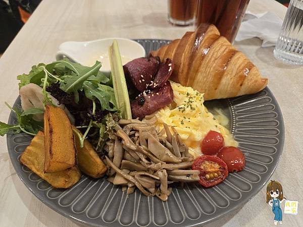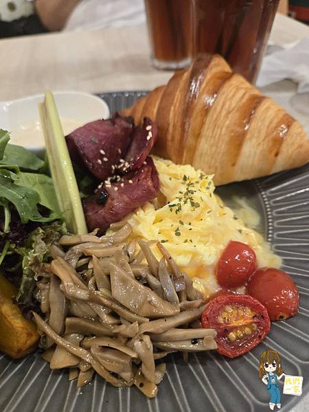 可頌層次分明,酥脆帶著濃郁奶香,搭配煎得金黃的培根、鮮菇炒蛋、蔬菜沙拉與地瓜,鹹香又飽足。