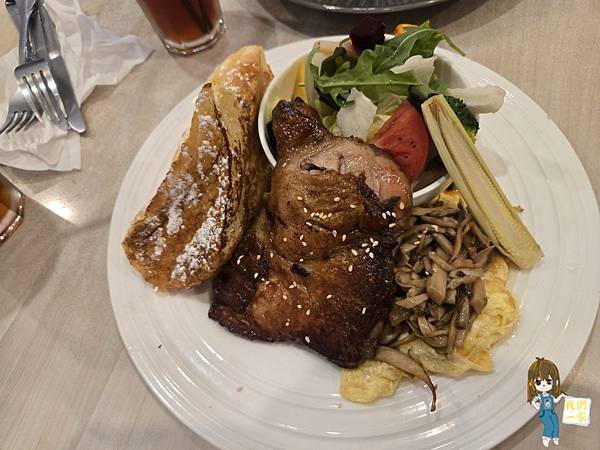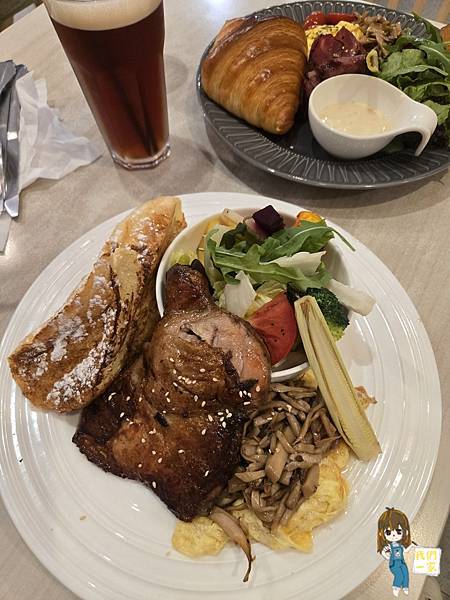 招牌烤雞腿外皮焦香酥脆,肉質鮮嫩,搭配歐雷法國麵包與野菜豆腐沙拉,份量十足又不失清爽。